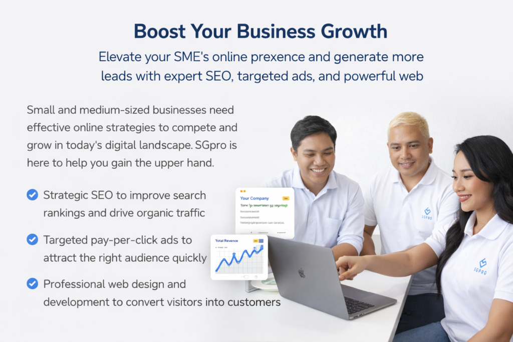 Small and medium-sized businesses need more than just a website to compete today. They need a complete digital growth strategy. At SGpro, we help SMEs strengthen their online presence through powerful SEO, targeted Pay-Per-Click advertising, and high-performing website design and development.